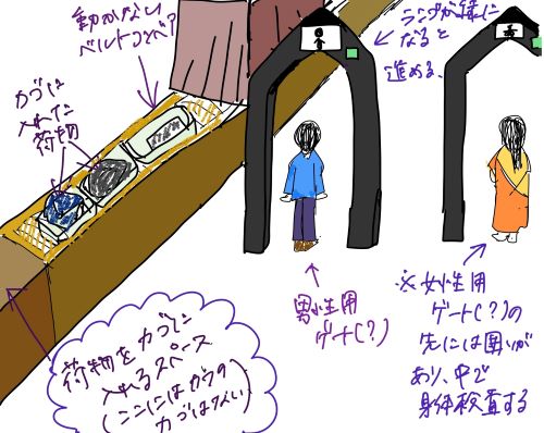 荷物をベルトの部分に載せてから身体検査場に向かうのですが、カゴが流れていないために、私はカゴを載せられず、いつまでたっても女性用の身体検査場に行けません。