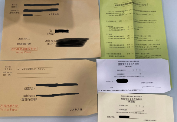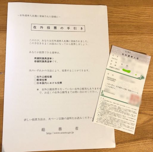選挙の2か月前くらいに投票用紙等請求書と在外選挙人証を提出するよう指示があったため、5月上旬に返送。